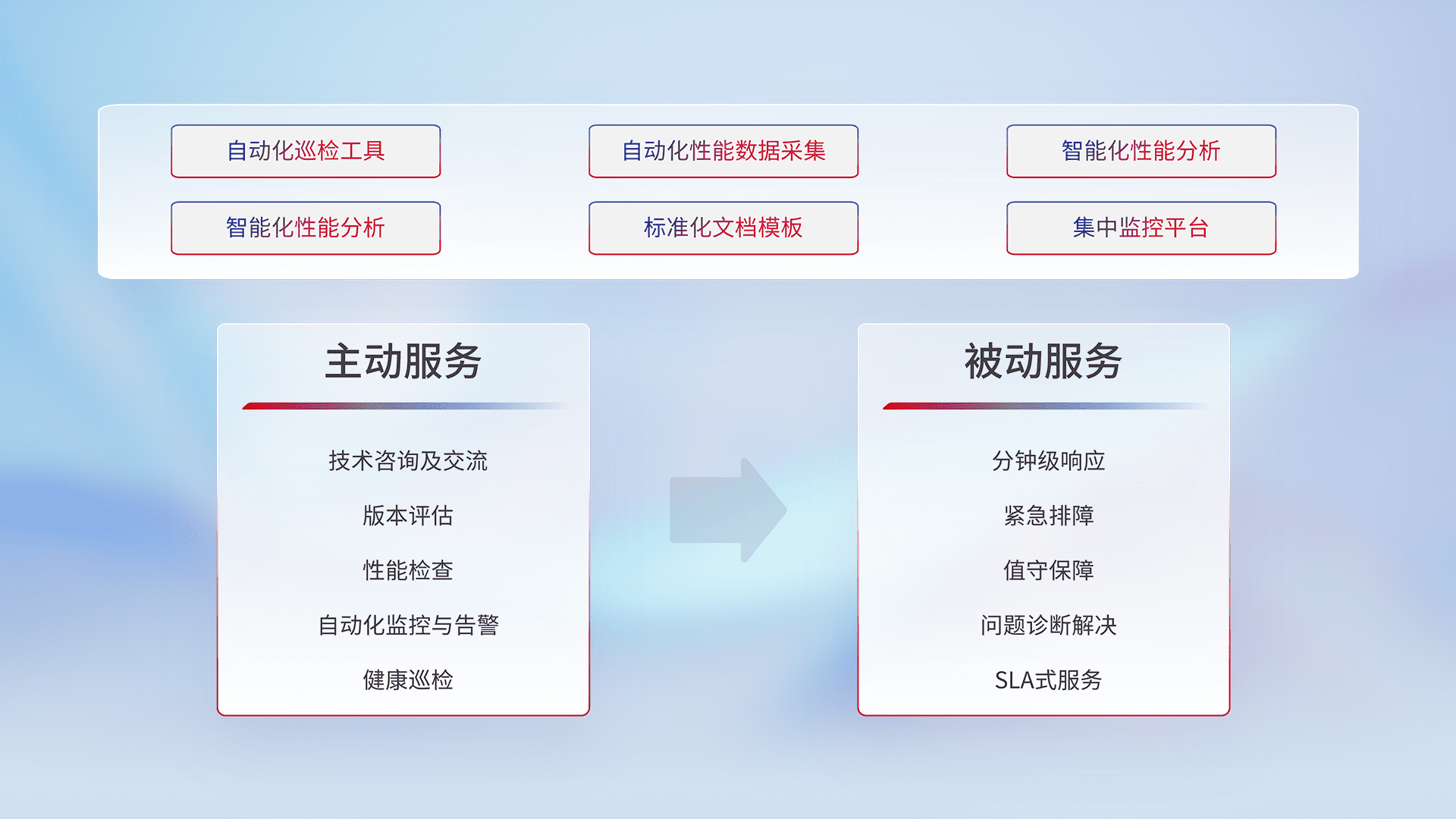 智能化工具和标准化文档,,保障服务质量,,提供主动服务(包含技术咨询、、、、版本评估、、、性能检查、、、自动化监控与告警、、、、健康巡检)和被动服务包含(分钟级响应、、、、紧急排障、、、值守保障、、问题诊断解决、、SLA服务)。。。